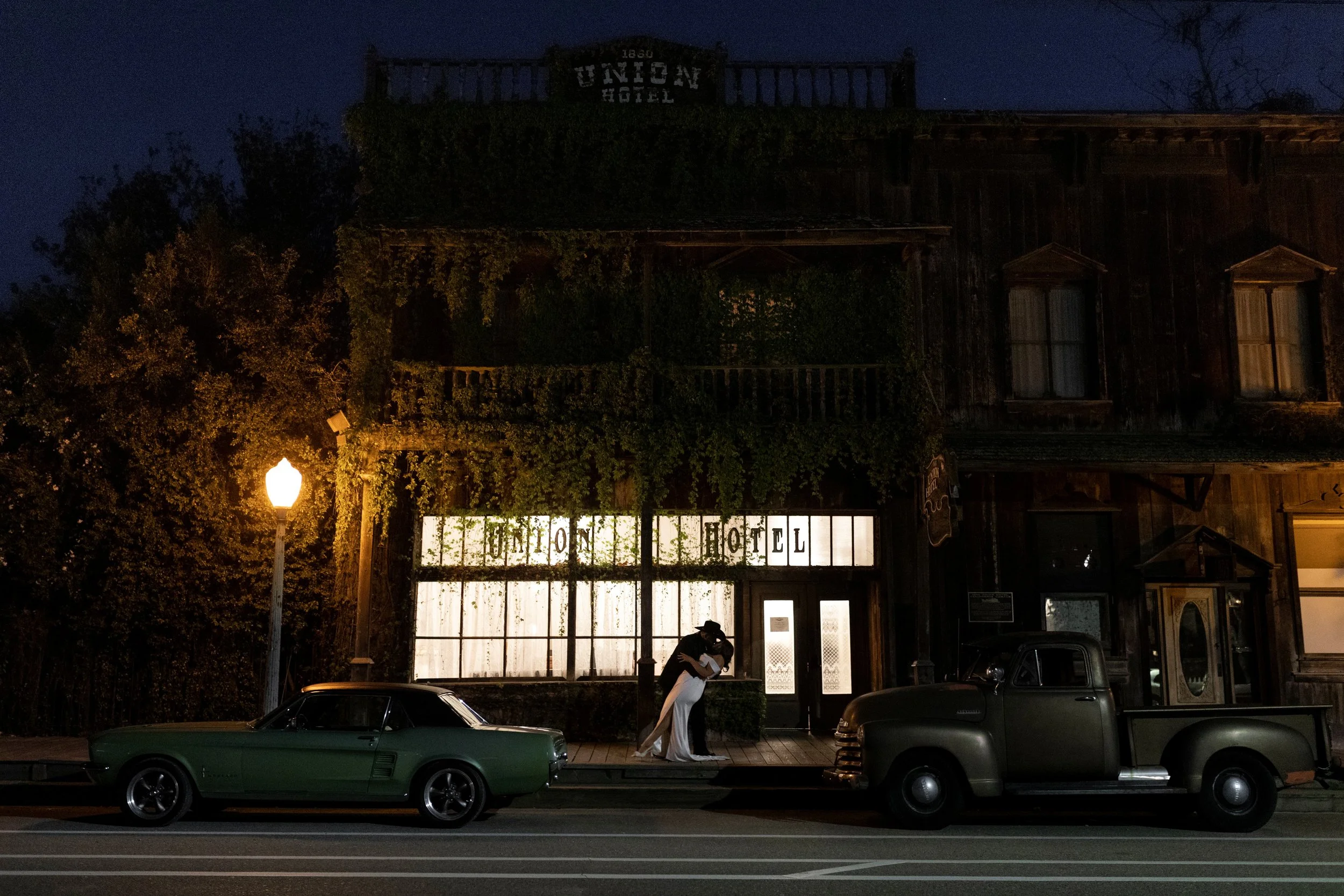 Nighttime scene in front of the Union Hotel with vintage cars parked on the street and a couple embracing on the sidewalk, illuminated by a streetlamp and inside lights.